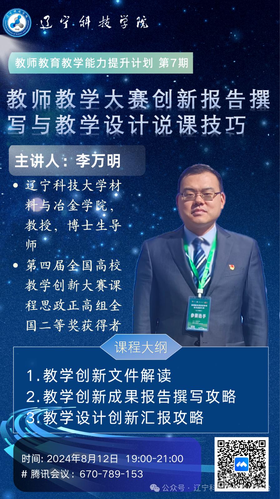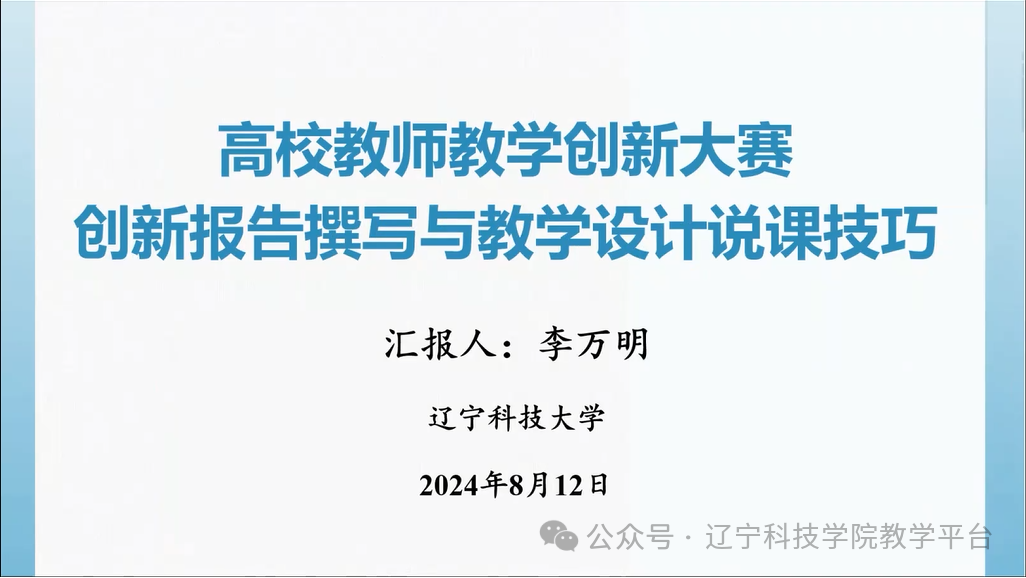 为帮助教师积极备战学校教师教学大赛总决赛和教师教学创新大赛,在教师教学大赛中更好的展示风采、提升大赛竞争力,学校于8月12日举办了“教育教学能力提升第七期专题培训——教师教学大赛创新报告撰写与教学设计说课技巧专项培训”。教务处邀请辽宁科技大学材料与冶金学院李万明教授,作题为“教师教学大赛创新报告撰写与教学设计说课技巧”的专项培训。本次专题培训得到广大教师的积极参与,共有215名教师报名参加培训,其中青年教师160余名,占总参加教师人数的70%以上。