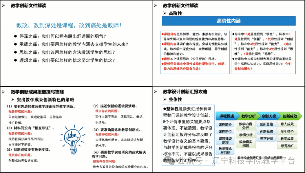 李老师从教师教学创新大赛专家角度,以丰富的案例、精彩的问题剖析,结合自己对教创赛的深刻理解及成功实践,对如何备战教师教学创新大赛、如何真正的在教学中做好改革创新进行了有针对性的培训指导。培训主要有三部分内容:1.教学创新文件解读;2.教学创新成果报告撰写攻略;3.教学设计创新汇报攻略。李老师在培训分享中解答了老师们在教学创新中的难点和痛点问题,有针对性的传授了创新报告撰写和教学设计说课技巧。参加培训的教师反响热烈,认为本次培训内容丰富、指导性强,有助于提升学校教师教学创新能力和教师大赛参赛水平。