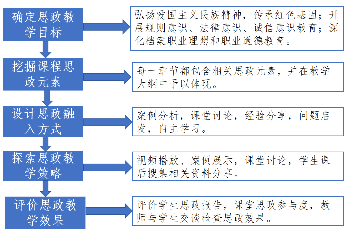 课程旨在培养学生掌握电子文件管理的基本原理,并具备结合实际解决实践问题的能力,具备基于证据的电子文件管理能力和从事组织机构电子文件管理实施的能力,能从体系、制度、流程、系统等多层面分析现有解决方案。同时,将课程思政内容与电子文件管理知识技能内容有机融合,坚持立德树人根本任务,结合课程教学内容与特点,深挖思政元素,弘扬以爱国主义为核心的民族精神,传承红色基因。引导学生牢固树立法治观念,加强学生的规则意识、法律意识、诚信意识教育,培养学生专业认同感和社会使命感,将知识传授、价值引领和红色文化教育相结合,实现育人和育才的协同效应。