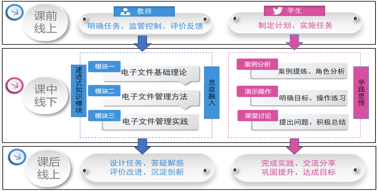 依据课程教学目标,本课程教学内容设计包括基础理论、管理方法和电子文件管理实践模块,基于电子文件管理流程一般理论与方法,将电子文件全流程管理设计为电子文件的捕获、归档、鉴定、保存、检索、利用等业务环节。教学中充分依托线上资源,促进学生自主学习,实现课堂微翻转,加强过程考核,明确学习评价方法。