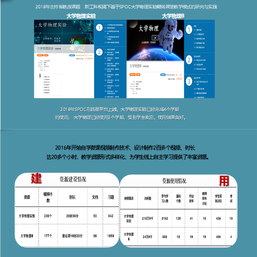 2018年自建《大学物理实验》、《大学物理B》SPOC,经过十个完整学期的使用取得良好成效。