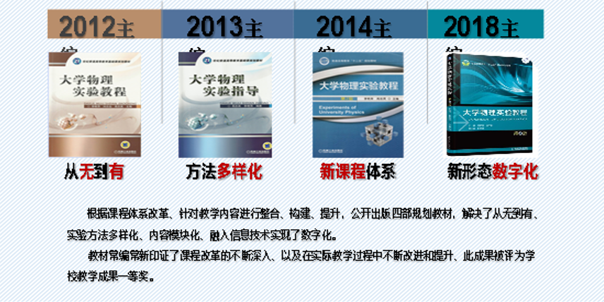 2018年主编公开出版规划教材四部,《大学物理实验教程》第三版是机械工业出版社推荐的数字化精品教材之一。