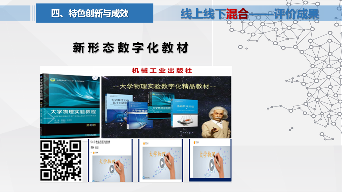 2016年开始自学微课视频制作技术、历时两年完成了教学视频的录制和后期制作。设计制作2百多个视频、时长达20多个小时,出版了《大学物理实验》第三版数字化教材,教学资源形式多样化,为学生线上自主学习提供了丰富资源。