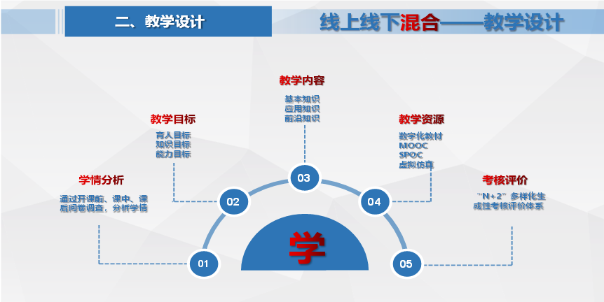 课程总体设计:以学生“学”为目的形成“3+2”线上线下混合教学,线上3:MOOC+SPOC+虚拟仿真 线下2:课题+实验室。